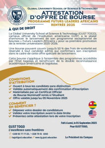 Le Togo accueille une nouvelle institution académique de classe mondiale : Global University of Science and Technology (GUST). Première mise en œuvre de GUST en Afrique francophone, ce campus ouvre ses portes à Lomé avec l’ambition de former la nouvelle génération de leaders et de professionnels capables d’évoluer dans un monde globalisé.